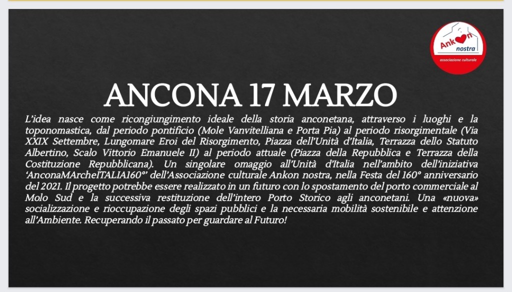 7/12/2020: la mia proposta per il 160° dell’Unità d’Italia: https://www.vivereancona.it/2020/12/07/anconamarcheitalia160-liniziativa-di-ankon-nostra-per-il-160-anniversario-dellunit-ditalia/867725/