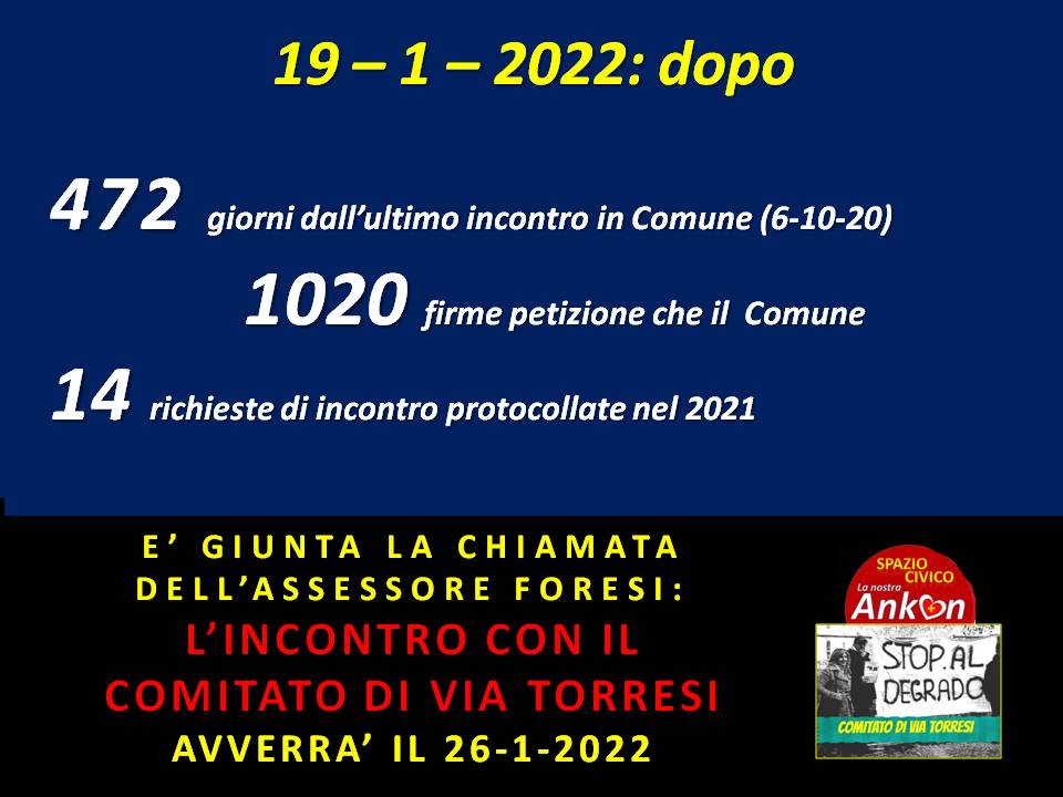 9/4/2021: Comitato cittadini di Via Torresi: Ho protocollato in Comune la richiesta di incontro del Comitato di Via Torresi con Assessori Sediari, Manarini, Foresi, Dirigenti Centanni e Fiorentino, Presidente ERAP Urbinati a sei mesi dal precedente incontro per verifica stato dei lavori manutenzione via Torresi, Scuole Savio, Asilo Sabin, edifici dismessi e supercondominio via Torresi 77/105. Vi terrò informati! https://www.facebook.com/groups/459436677440530