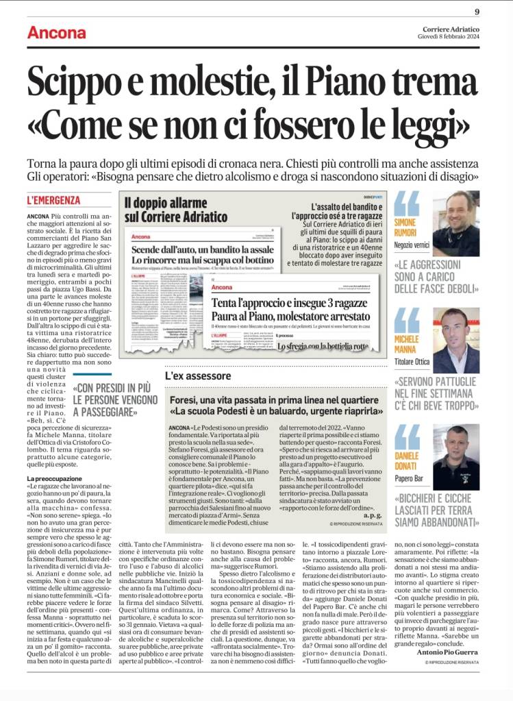 14-10-25: Piano, scontro sulla riqualificazione: l’Amministrazione inaugura e promette, ma il Comitato Cittadini attacca: “Interventi spot, siamo inascoltati” Il sindaco Silvetti inaugura il presidio della Polizia Locale e annuncia un piano di rilancio per il quartiere. Ma il Comitato dei cittadini insorge: “Solo interventi spot e passerelle. I veri problemi vengono ignorati”. (vedi pagina i miei comitati) https://www.anconatoday.it/attualita/ieri-piano-scontro-sulla-riqualificazione-l-amministrazione-inaugura-e-promette-ma-il-comitato-cittadini-attacca-interventi-spot-siamo-inascoltati.html