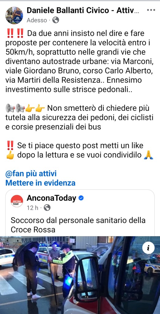 6-11-2025: C’è ad Ancona, con questa visione politica al governo, troppa deregulation sulla mobilità privata a scapito di quella pedonale, ciclabile e del trasporto pubblico.. E troppa velocità non dissuasa. Mentre la strada, per il Codice, è di tutti! In 24 ore tre persone gravi in ospedale, un pedone travolto da un’auto, un motociclista travolto da un’auto che faceva inversione ad U e uno in monopattino travolto da un camion. In tutti e tre i casi autoveicoli travolgono persone.. Serve una mobilità più sostenibile perché potrebbe accadere a chiunque essere vittima di investimenti per la troppa velocità, mancate precedenze o rimanere a terra per diminuzioni di bus. Vedi articolo