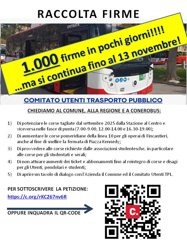 Il Comitato Utenti TPL di Ancona annuncia che è stato raggiunto l’obiettivo di mille firme a sostegno delle richieste. L’obiettivo dichiarato era raccogliere 1000 firme dal 13 ottobre al 13 novembre in protesta ai forti tagli avvenuti al trasporto pubblico dal 2024 e soprattutto dal 15 settembre 2025. È stato trovato grandissimo favore tra le persone che hanno firmato la petizione in strada e nei punti principali; pertanto, la raccolta firme va avanti fino al 13 novembre. Dopodiché la petizione sarà depositata al Comune di Ancona e a Conerobus per chiedere l’accoglimento delle richieste che abbiamo specificato negli obiettivi della petizione stessa.