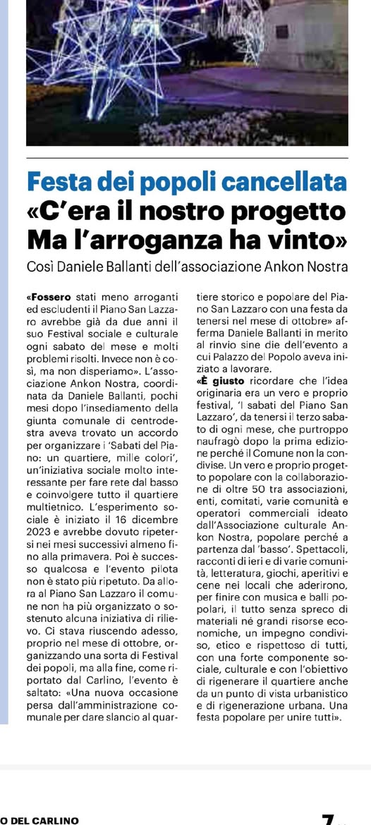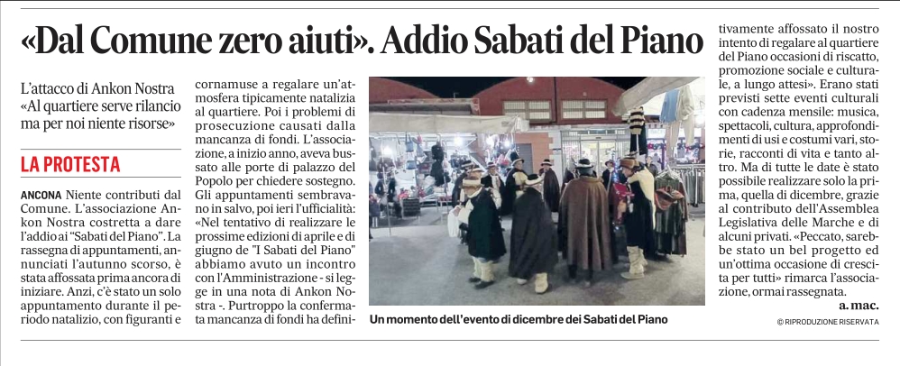 Purtroppo il Comune di Ancona non è stato nei nostri confronti e delle nostre tematiche un buon collaboratore, specificatamente alcuni Assessori (come facilmente documentabile). Gli ultimi mesi sono stati molto, molto duri, perché essere indipendenti nel panorama culturale e civico della città e non far parte dla corte é cosa assai dura. Diversi collaboratori che all’inizio si erano mostrati interessati dando la disponibilità di ospitare i nostri eventi (di cinema, di scambi interetnici ed interculturali, di musica, di educazione ambientalista, ecc…), soprattutto nel quartiere Piano San Lazzaro che ha così bisogno più attenzione, si sono poi ritirati. Enti culturali di cinema, enti religiosi, comitati di quartiere, qualche giornalista, qualche lavoratore di settori di interesse pubblico, addirittura Enti di beneficenza (quelli che si dicono “buoni”).. Lo sgarbo della Fondazione Ospedale Riuniti, per la quale ho realizzato nel 2011 un grande evento per il Centenario dell’ospedale Umberto I, la cui presidente ho sostenuto nei momenti più difficili, per la quale è stata finalizzata la raccolta fondi di Ankon nostra per l’iniziativa benefica prevista per quest’anno in occasione del nostro grande evento “I 160 anni dell’Unità d’Italia ad Ancona” che ha dato forfait a quattro ore dal debutto del convegno del 9 luglio scorso. Alcuni commercianti politicizzati, in malafede, che inducono dei loro colleghi a prendere le distanze dalle iniziative fatte per i propri quartiere (e che invece riscuotono entusiasmo). Le rassicurazioni fatte da un assessore, testimone un giornalista locale, sull’accoglimento di una nostra proposta per l’esibizione di due musicisti anconetani nel cartellone estivo, per la quale ci raccomandava di fargli pervenire una richiesta ufficiale, cosa avvenuta per PEC, salvo poi non dare nessuna risposta scritta ed apprendere le avvenute esibizioni alla presenza dell’assessore che si faceva il bello, escludendo chi l’aveva proposta, cioè il sottoscritto.