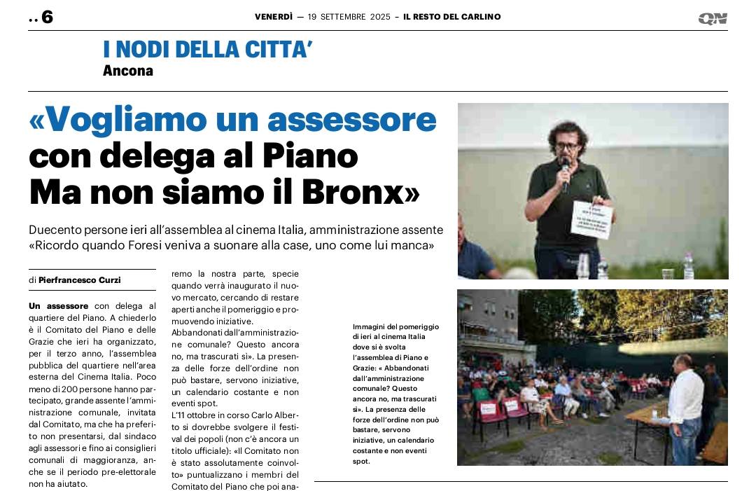 14-10-25: Piano, scontro sulla riqualificazione: l’Amministrazione inaugura e promette, ma il Comitato Cittadini attacca: “Interventi spot, siamo inascoltati” Il sindaco Silvetti inaugura il presidio della Polizia Locale e annuncia un piano di rilancio per il quartiere. Ma il Comitato dei cittadini insorge: “Solo interventi spot e passerelle. I veri problemi vengono ignorati”. (vedi pagina i miei comitati) https://www.anconatoday.it/attualita/ieri-piano-scontro-sulla-riqualificazione-l-amministrazione-inaugura-e-promette-ma-il-comitato-cittadini-attacca-interventi-spot-siamo-inascoltati.html
