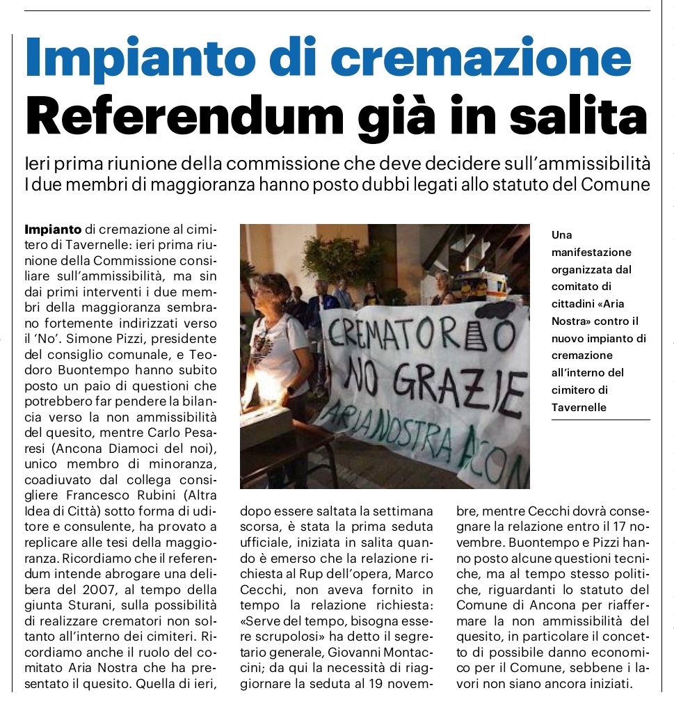 19-10-25: Sempre accanto con il Comitato Aria Nostra: il crematorio va realizzato in una zona più delocalizzata rispetto al popoloso quartiere di Tavernelle https://www.ilrestodelcarlino.it/ancona/cronaca/caso-impianto-crematorio-spunta-serbatoio-64595cfd?1760859701&fbclid=IwY2xjawNt6N5leHRuA2FlbQIxMQABHqnhNbwbuBR8IOdr_qny5MfFz4SzCJDxQnnTB8I0OI1ASO4VqboqP_ycltcK_aem_5N52taxjbpELYYeEOsYs8w