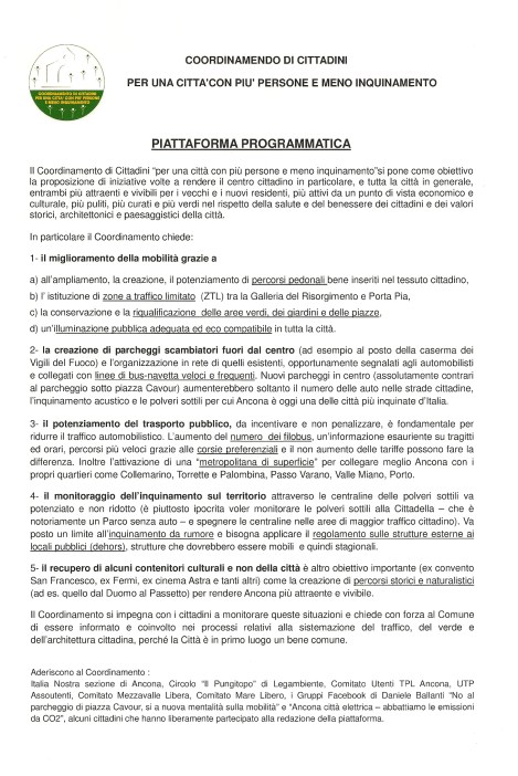 Italia Nostra sezione di Ancona, Circolo “Il Pungitopo” di Legambiente, Comitato Utenti TPL Ancona, UTP Assoutenti, Comitato Mezzavalle Libera, Comitato Mare Libero, i Gruppi Facebook di Daniele Ballanti “No al parcheggio di piazza Cavour, si a nuova mentalità sulla mobilità” e “Ancona città elettrica – abbattiamo le emissioni da CO2”, alcuni cittadini che hanno liberamente partecipato alla redazione della piattaforma.