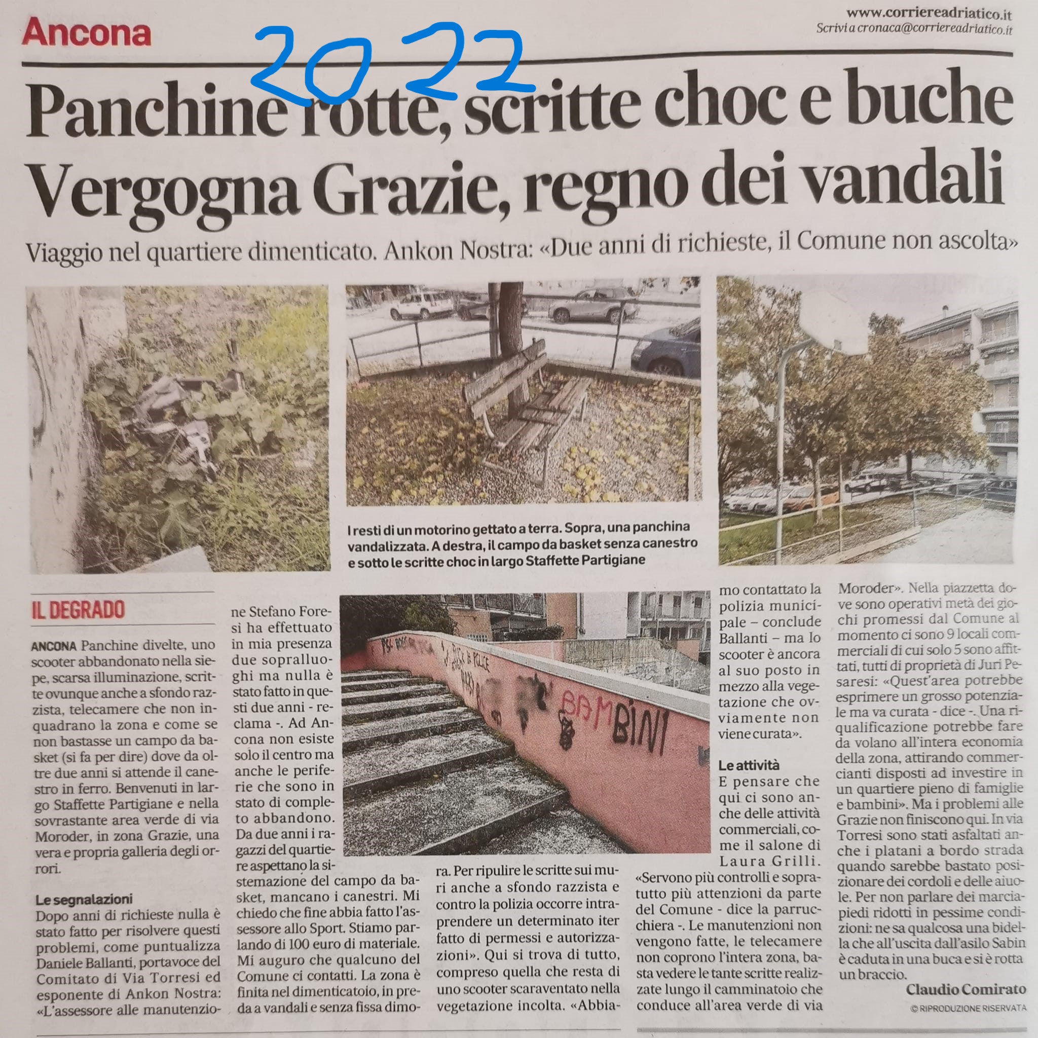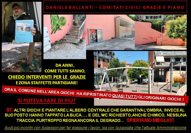 23-6-24: Il Comune: “Nuovi giochi al largo Staffette Partigiane”. Come portavoce attuale del Comitato Cittadini Piano e Grazie e portavoce storico del Comitato spontaneo di Cittadini via Torresi/Seppilli ricordo che è da anni che chiediamo al Comune di intervenire contro il degrado dell’intera area. Un anno fa, ricevuti dall’assessore Berardinelli, chiedemmo tra le altre cose la sostituzione dei giochi vandalizzati. Oggi quasi tutti sono stati riposizionati, finalmente, e pertanto ringraziamo l’Amministrazione. Tuttavia l’area presenta ancora scalinate deturpate da scritte e insulti, scalette in parte inagibili per caduta di fango e sassi, campo da basket senza canestri, portelli dei contatori di AnconaAmbiente e dell’acqua divelti, orinatoi sulle mura dei negozi ed altro ancora che potrete visionare nelle foto in allegato. Da anni denunciamo questa situazione. Continuiamo ad attendere interventi anche su queste criticità!
