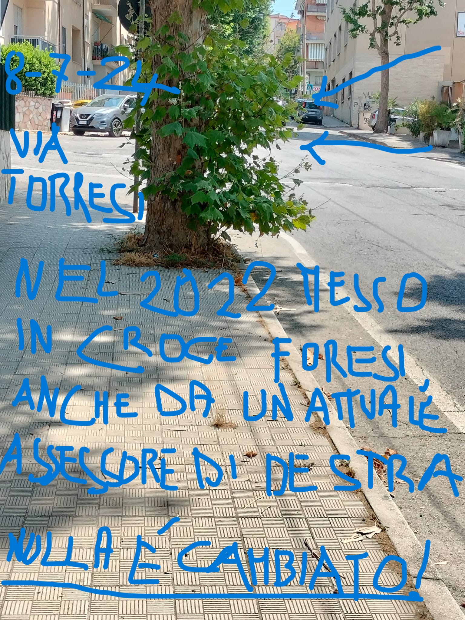 8-7-24: Con il Comitato spontaneo di Cittadini di Via Torresi e Seppilli che ho fondato nel 2011 ho seguito molte problematiche del quartiere, ad iniziare la petizione di 1.176 firme con la quale si chiedeva la ristrutturazione delle mura pericolanti di Via Torresi. Una seconda petizione nel 2021, 1000 firme per chiedere cura e lotta al degrado che ha parzialmente portato frutti. C’è da dare atto che l’Assessore Stefano Foresi ha sempre riconosciuto in me il punto di riferimento del Comitato e spesso è venuto a fare ricognizioni insieme. Cosa che purtroppo con il cambio dell’Amministrazione non è avvenuta nonostante abbiano i miei contatti (un tentativo di isolamento?).