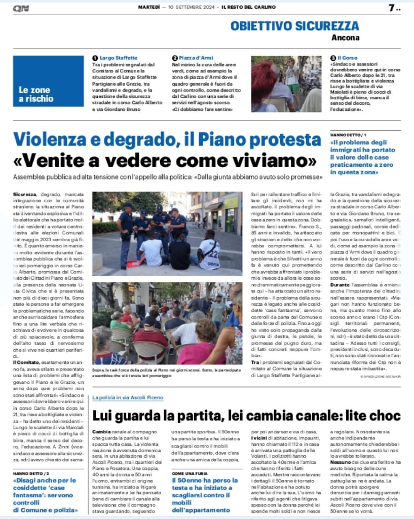 ‼️ Stanno purtroppo giungendo polemiche sugli organizzatori della grande assemblea e ci spiace perché tante brave persone vogliono dimostrare la necessità di avere attenzioni ‼️ L’Amministrazione comunale è stata correttamente invitata, nessuno l’ha esclusa, anzi, è un peccato non sia intervenuta, tanto che le sedie riservate sono rimaste vuote. Uno degli assessori invitati ci ha risposto motivando l’assenza (inizio assemblea alle ore 18.00) per “impegni nell’evento di Posatora”. Abbiamo ricordato ciò che il Quartiere chiede su degrado, incuria, igiene, mobilità, sicurezza, eventi, ecc.. fin da luglio 2023. Nonostante le promesse e gli incontri non è stato ancora fatto. Solo annunci del Mercato (che da solo non risolve i problemi). Specifichiamo che nessuno del Comitato si propone come assessore: la richiesta di un assessore dedicato è motivato per l’assenza di assessori tra la gente al di là se ci abitano o meno. Scelgano chiunque ma i cittadini del Piano e dei quartieri intorno desiderano esprimere che Ancona non è solo il centro e non esistono quartieri di serie A e B, negozi di serie A o B, cittadini di serie A o B! Il rapporto con i cittadini si si costruisce con la fiducia, la cura e la quotidianità e il Comitato le ha ed attende risposte e fatti!