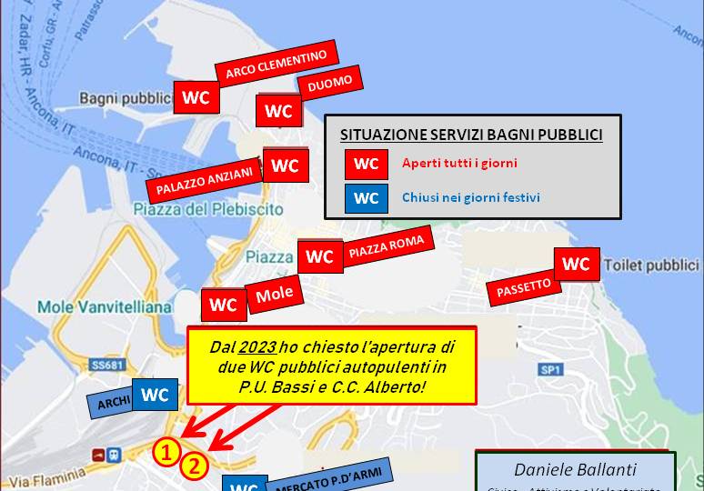 14-3-25: Mappa della situazione del servizi di bagni pubblici dopo le mie proposte fatte dal 2023. In centro fino alla Mole Vanvitelliana i servizi igienici ci sono, ma oltre, sia al Parcheggio degli Archi che al Mercato di Piazza d’Armi nei giorni festivi sono chiusi. Praticamente non c’è nessun bagno pubblico oltre a quelli del centro città, in merito ai quali sul grado di manutenzione e pulizia non scendiamo nei particolari. Servirebbe un servizio di personale (anche volontario attraverso varie possibilità) come si usava una volta per tenerli puliti ed evitare atti vandalici.
