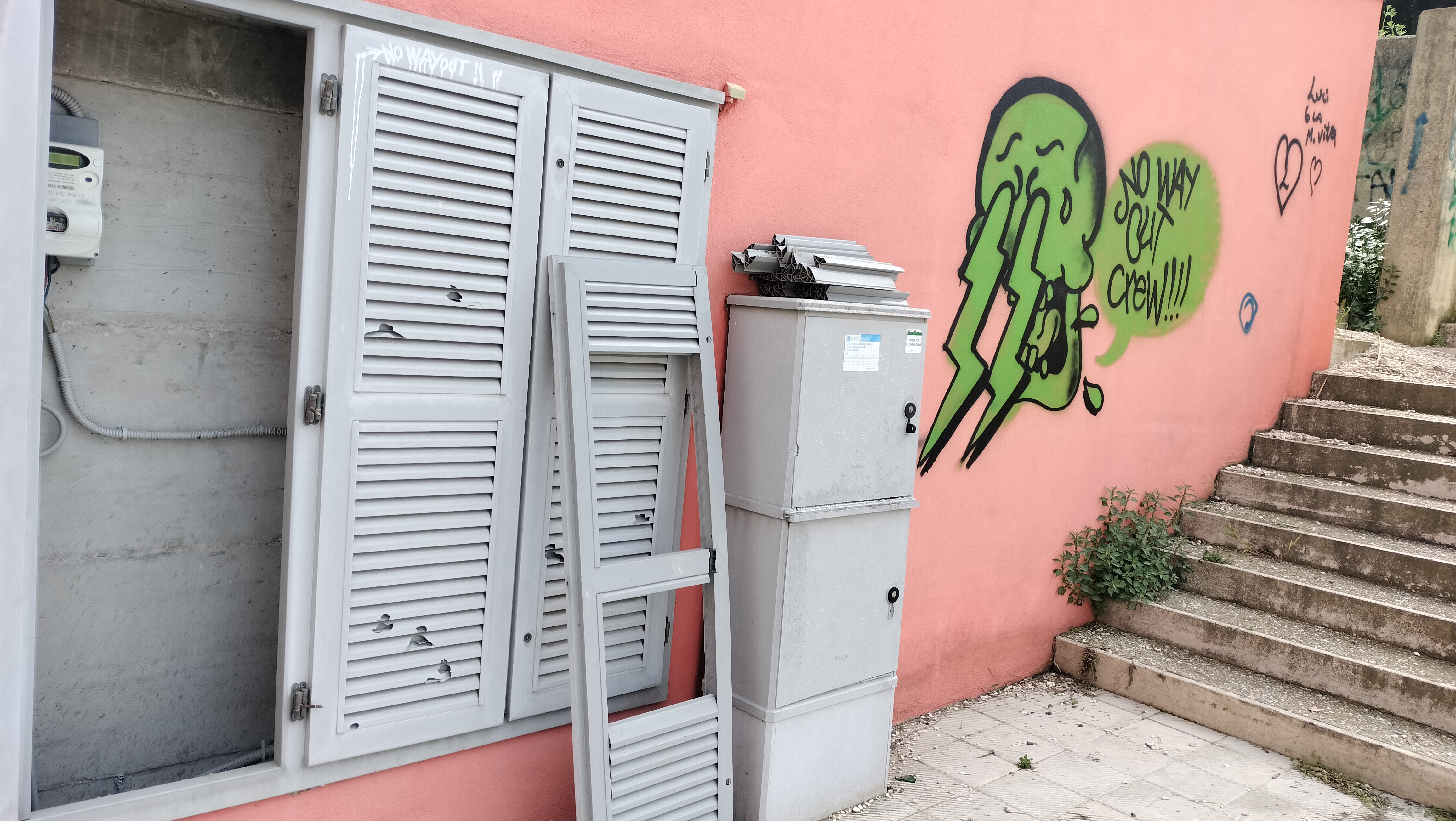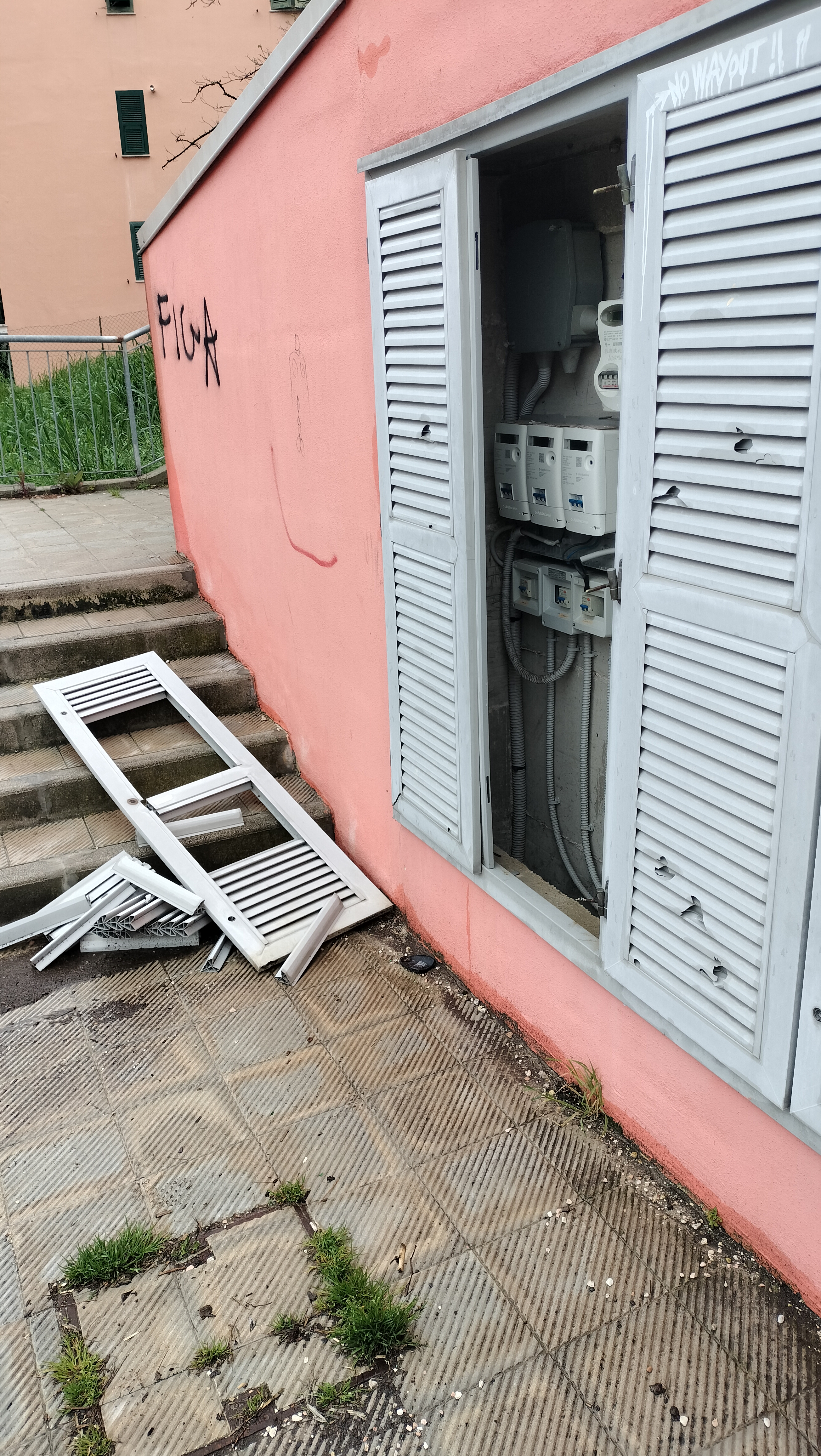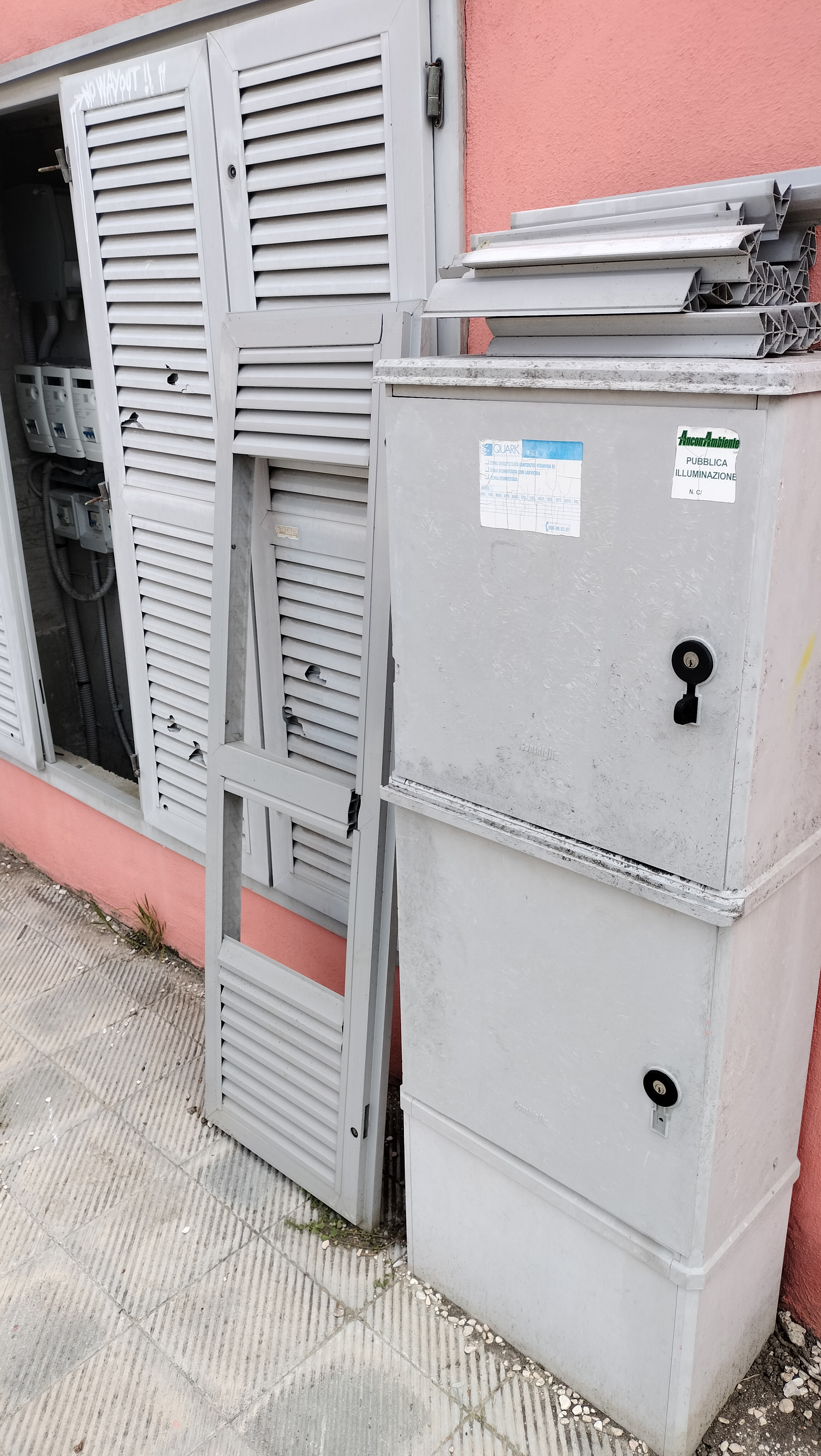2) vani contenitori dei contatori della luce pubblica stradale divelti e mai sostituiti (la luce a volte viene staccata per divertimento di qualcuno)
