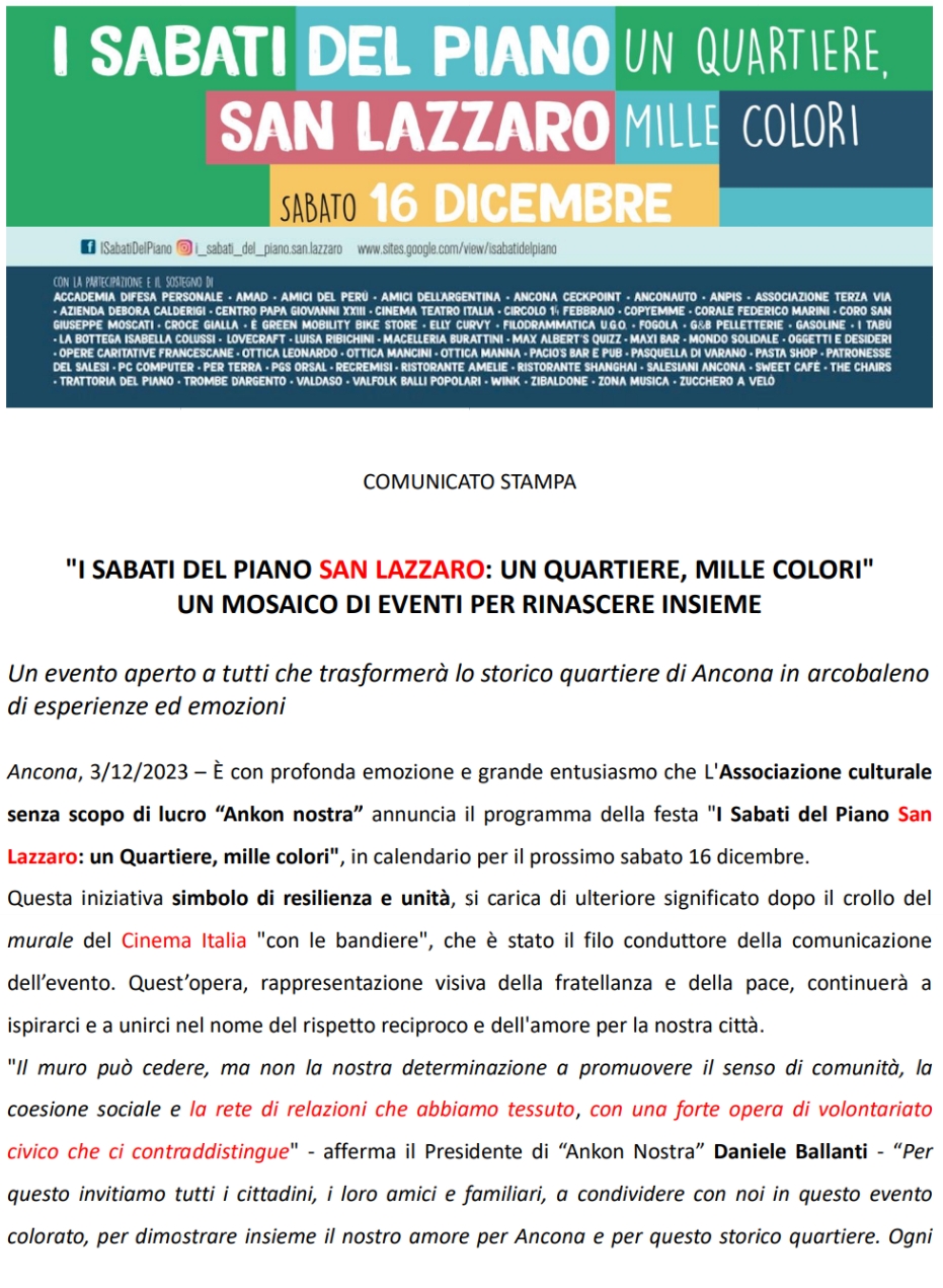 L’attenzione alla situazione del Piano San Lazzaro è stata per me una priorità al punto che con la mia Associazione culturale Ankon nostra nel 2023 coinvolgemmo moltissimi Operatori commerciali del Piano  nell’organizzazione del Festival  “I Sabati del Piano San Lazzaro”, una Festa della durata di sei mesi da ripetere ogni sabato del mese dalle 15.00 alle 24.00 nelle strade, piazze e locali del quartiere con incontri culturali, libri, vernacolo, teatro, spettacoli per bambini, balli popolari locali e delle altre etnie, mangiare, musica, ecc.. Il Comune non la sostenne assolutamente (nonostante le promesse ricevute in campagna elettorale di ricevere attenzioni per il quartiere), anzi ci fece pagare pure una sala civica, quella di Via Scrima, e dopo la prima edizione di dicembre che si è svolta solo perché sostenuta invece dal Consiglio Regionale e dal Presidente Dino Latini, tutta l’iniziativa boicottata di fatto, naufragò.
