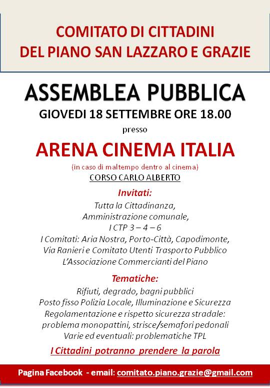 Vista la disattenzione da parte della nuova Amministrazione il Comitato di Via Torresi (attivo dal 2011) si ampliò diventando “Comitato di Cittadini di Piano San Lazzaro e Grazie” ed organizzò delle assemblee pubblica in piazza con la presenza di 120-150 persone (come documentato anche dai quotidiani). Invitammo anche Zinni e Berardinelli (mentre il Sindaco non riuscì a partecipare per impegni personali) e dando la possibilità ai Cittadini di interloquire direttamente con l’Amministrazione. Ne uscì un documento del Comitato con le richieste che consegnammo all’Amministrazione (bagni pubblici assenti, poca sicurezza negli attraversamenti pedonali, degrado, verde, zone buie, sicurezza, parchi dei bambini e campetti da basket inutilizzabili, ecc..) le quali, nonostante i solleciti più volte effettuati, non ha portata alla giusta attenzione.