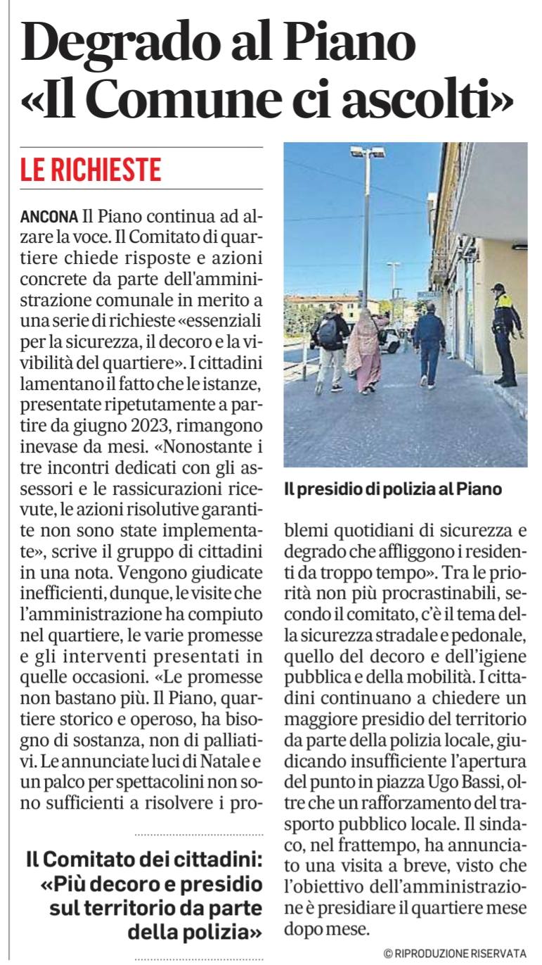 14-10-25: Piano, scontro sulla riqualificazione: l’Amministrazione inaugura e promette, ma il Comitato Cittadini attacca: “Interventi spot, siamo inascoltati” Il sindaco Silvetti inaugura il presidio della Polizia Locale e annuncia un piano di rilancio per il quartiere. Ma il Comitato dei cittadini insorge: “Solo interventi spot e passerelle. I veri problemi vengono ignorati”. https://www.anconatoday.it/attualita/ieri-piano-scontro-sulla-riqualificazione-l-amministrazione-inaugura-e-promette-ma-il-comitato-cittadini-attacca-interventi-spot-siamo-inascoltati.html