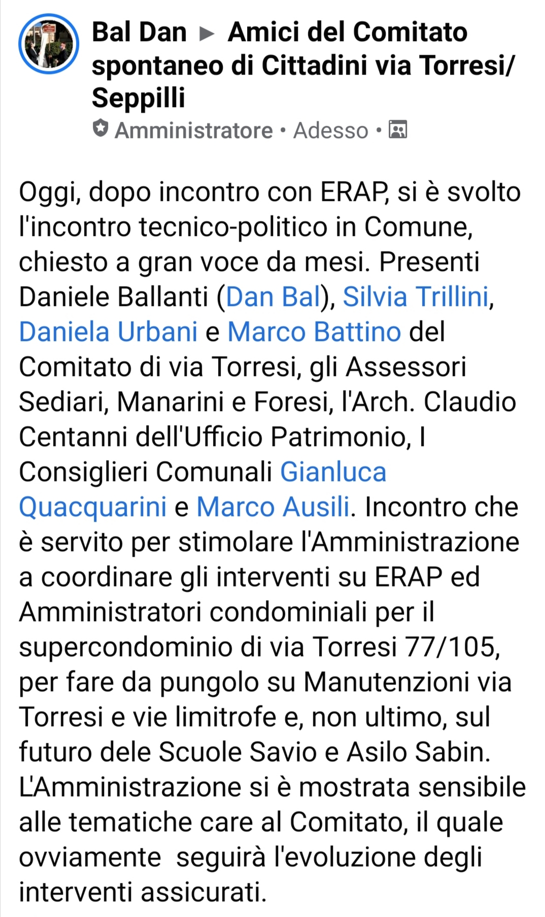 Fondatore di: Associazione culturale Ankon Nostra, Movimento Ankon Civica Verde e Popolare, Comitato Cittadini di Via Torresi e Comitato di Cittadini del Piano San Lazzaro e Grazie