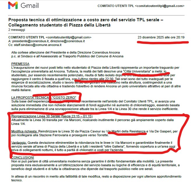 2-4-26: A seguito delle dichiarazioni delle rappresentante degli Studenti, Sabrina Brizzola, “per essere Ancona città universitaria servono servizi, no slogan vuoti!!, che condivido in pieno, pubblico la richiesta al Comune e Conerobus per proposta A COSTO ZERO (!!!!) per dare bus alle persone e studenti che devono fare a piedi la Galleria dopo le 22.30 (seppur vietata al transito) perchè isolati…