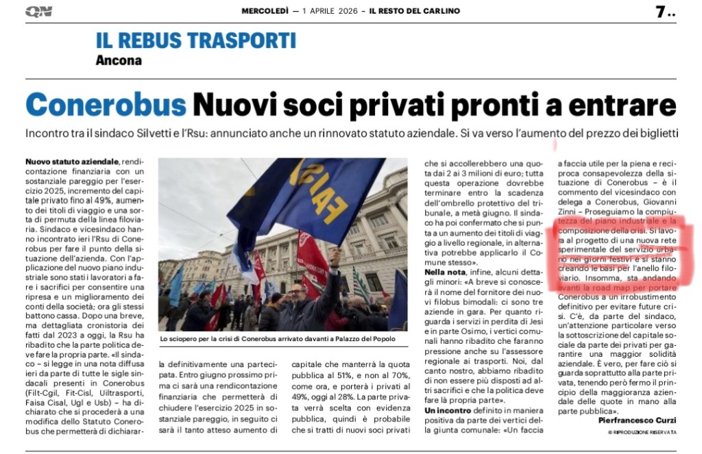 19-10-25: La crisi di Conerobus. Contro tagli e disservizi raccolte subito 500 firme https://www.ilrestodelcarlino.it/ancona/cronaca/la-crisi-di-conerobus-contro-53de516d?1760860503&fbclid=IwY2xjawNt5vRleHRuA2FlbQIxMQABHsTXzLrY7AfAa7XjbDlwEV77OKc9ycEtv95kFUEYtlf9hovnYU_CQmfFi2CF_aem_87K4JmbF783uEfPFrpl7mA
