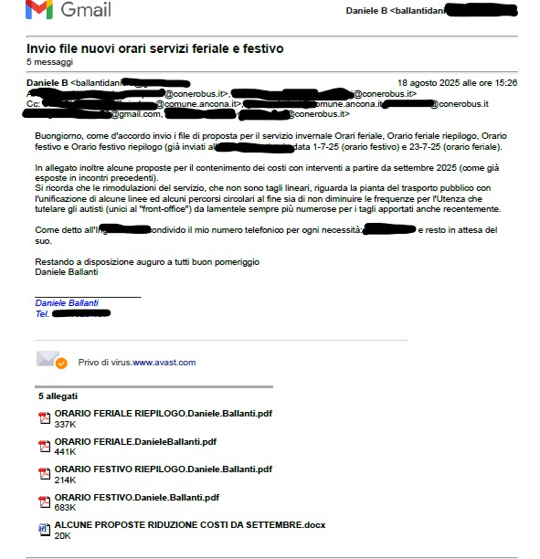 Il 22-8-2025 feci le mie osservazioni in merito ai tagli delle corse bus dal 15 settembre. Conerobus previde una sola corsa nel pomeriggio sulla linea 10 quando escono dal lavoro centinaia di lavoratori; osservai che servivano almeno tre corse ma non venni ascoltato.